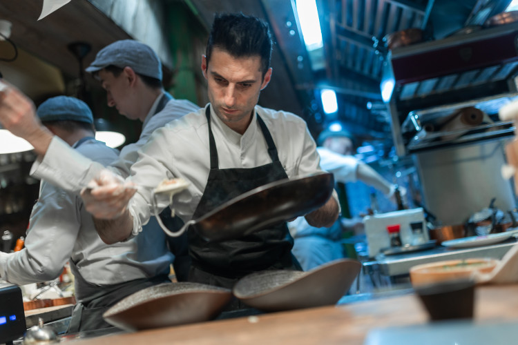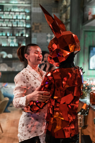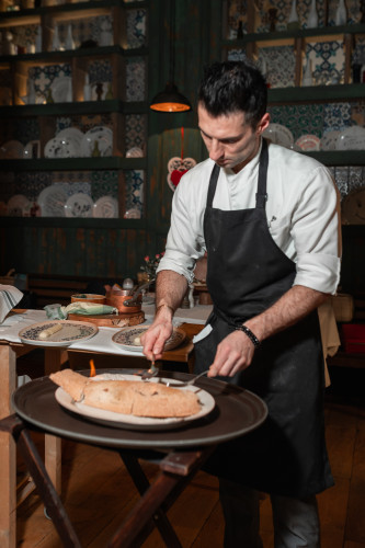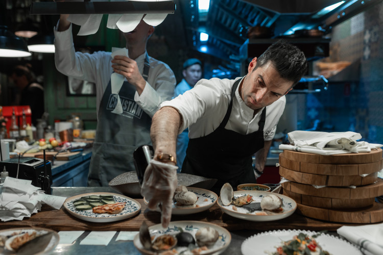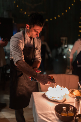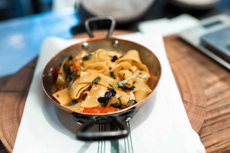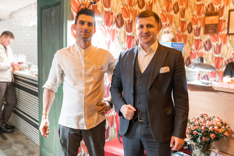 Шеф-повар Кристиан Лоренцини в этот вечер готовил праздничный сет для влюбленных. В него вошли легкие, яркие и разнообразные блюда. Первым подавали ассорти из морепродуктов крудо ди маре: устрицы, ежи, тартар из тунца, мини-кальмары и розовые креветки с авторскими соусами. Далее горячую закуску сахалинскую спизулу гратен, элегантно украшенную цветами. Продолжением ужина стали домашние черные спагетти «Гитара» с крабом, авокадо, белым кунжутом в сливочном соусе, а как основное блюдо - большой сибас в соли с артишоками и сицилийским соусом. На десерт — нежный сабайон с манго и маракуйей.