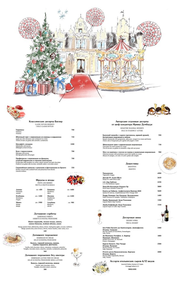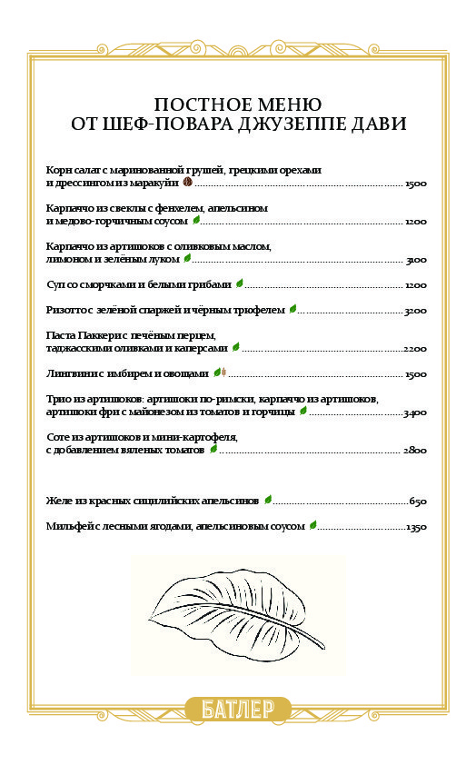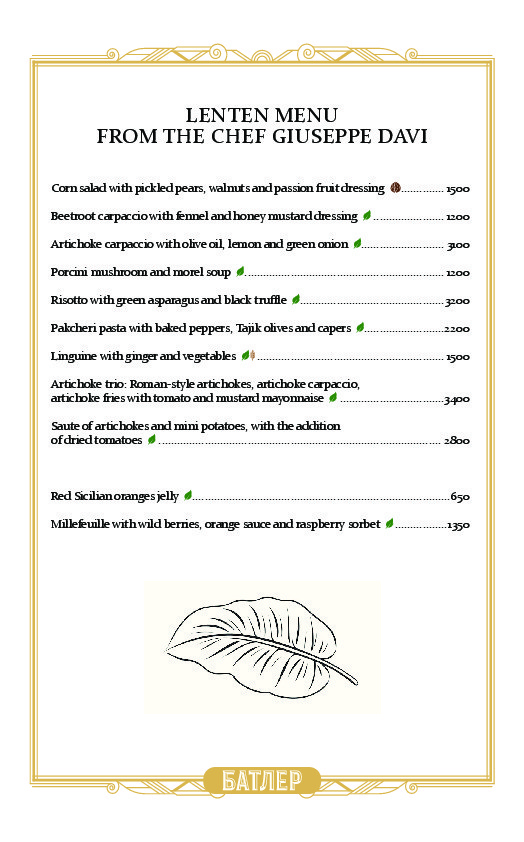 В меню ресторана Батлер много традиционных сицилийских блюд, рецепты которых Дави знает с детства. Среди закусок, например, классическое карпаччо из красных сицилийских креветок, заправленных цитрусовым соусом и мятой, а также карпаччо из лангустина, кальмары с артишоками, севиче из красного снаппера с соусом из маракуйи, карпаччо из маринованного гребешка с апельсином, редисом, сельдереем и боттаргой из кефали.