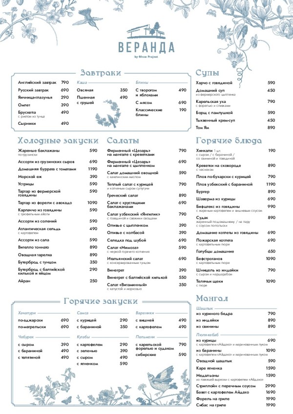 Ресторан «Веранда» на проспекте Маршала Блюхера ждёт активных петербуржцев, которые ценят комфорт, природу и её органичное вплетение в пейзаж мегаполиса. Большие, застекленные залы, светлый интерьер, собственная территория, парковка и детская площадка, классика европейской и кавказской кухни — здесь есть всё, что нужно для качественного отдыха в современном городе.