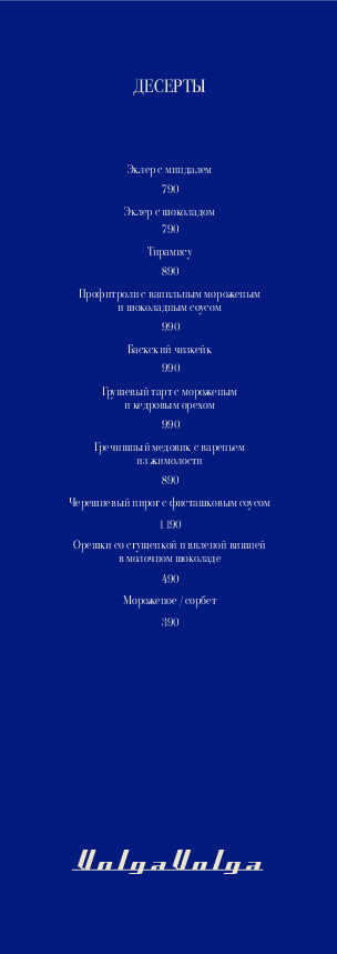 Меню ресторана сочетает в себе кулинарные традиции разных кухонь мира: итальянской, европейской и русской. Особое внимание уделено морепродуктам и рыбным деликатесам. Обязательно попробуйте фирменные блюда ресторана: тартар из камчатского краба, запеченые фаланги краба.