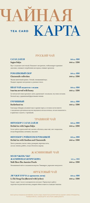 Меню ресторана сочетает в себе кулинарные традиции разных кухонь мира: итальянской, европейской и русской. Особое внимание уделено морепродуктам и рыбным деликатесам. Обязательно попробуйте фирменные блюда ресторана: тартар из камчатского краба, запеченые фаланги краба.