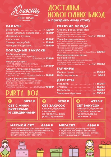 Классику жанра никто не отменял: под руководством бренд-шефа Изо Дзандзавы готовят хачапури, харчо и душистый аджапсандал, с мангала отдают шашлыки из телятины и люля-кебаб из индейки, с тандыра — горячий лаваш. Ароматный сванский пирог кубдари из баранины и карпаччо из баранины, пряная форель запеченная в пергаменте с овощами и хашлама из телятины — вот она, многоликая, пряная и харизматичная грузинская кухня. Пришли многолюдной веселой компанией — просите каре ягненка: сочное мясо зажарят у вашего стола в грузинской сковороде кеци; просите хрустящую лодочку с люля-кебабом из ягненка с сыром и зеленью. «Юность» — ресторан семейный. В светлом детском пространстве для малышей приготовили карандаши-раскраски и чудо-дом, где можно отдохнуть от родителей, для юных гостей постарше — развивающие игры. На крыше появился отдельный панорамный банкетный зал. В винной карте традиционное грузинское саперави соседствует с яркими винами Тосканы, тонкими бургундскими и насыщенными напитками Нового Света.