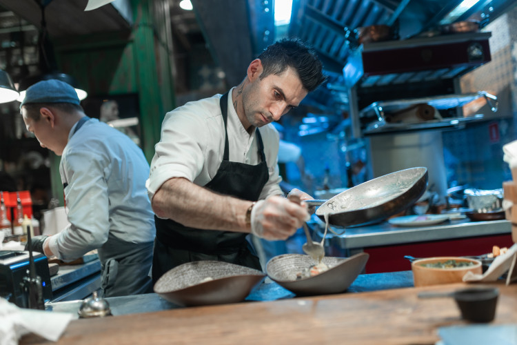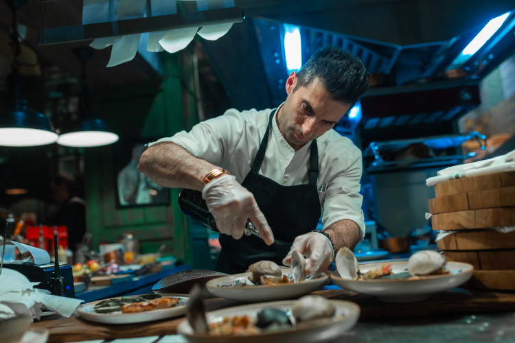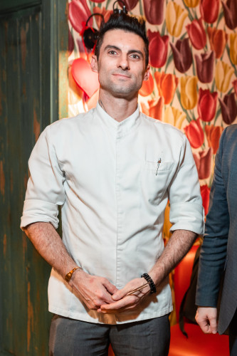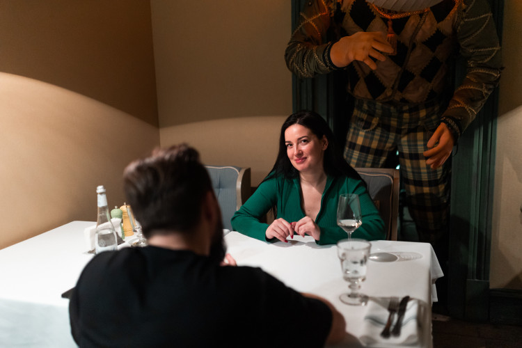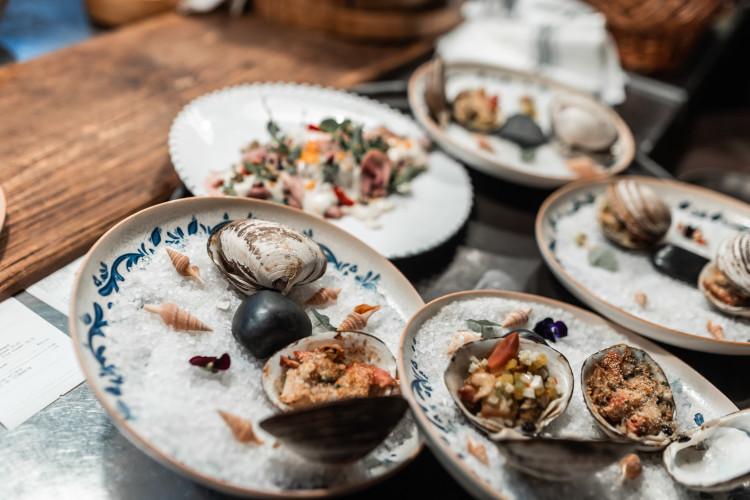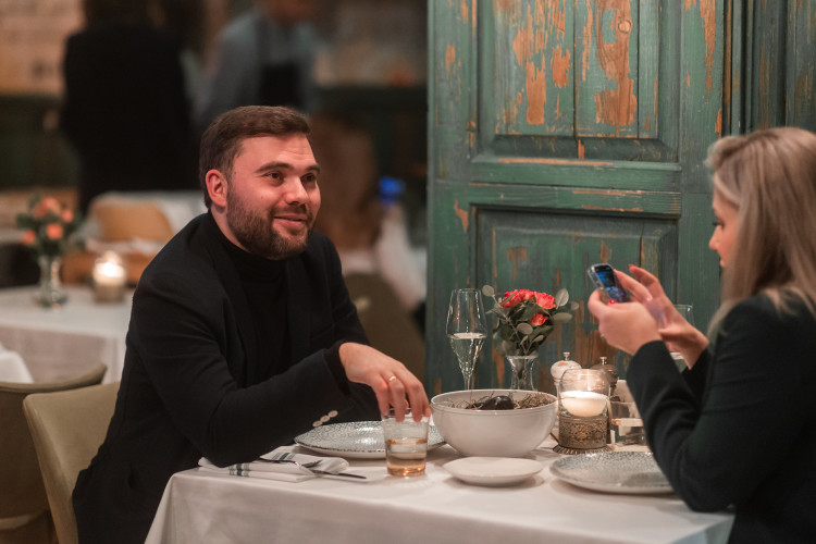 Шеф-повар Кристиан Лоренцини в этот вечер готовил праздничный сет для влюбленных. В него вошли легкие, яркие и разнообразные блюда. Первым подавали ассорти из морепродуктов крудо ди маре: устрицы, ежи, тартар из тунца, мини-кальмары и розовые креветки с авторскими соусами. Далее горячую закуску сахалинскую спизулу гратен, элегантно украшенную цветами. Продолжением ужина стали домашние черные спагетти «Гитара» с крабом, авокадо, белым кунжутом в сливочном соусе, а как основное блюдо - большой сибас в соли с артишоками и сицилийским соусом. На десерт — нежный сабайон с манго и маракуйей.