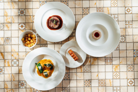 - Равиоли фаршированные перепелкой с соусом из пармезана/ маринованного перепелиного желтка с черным трюфелем