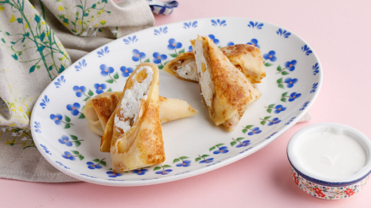Блины с мясом и яйцом, с лососем и крем-чизом, блины с капустой и яйцом. На десерт – блины с яблоком и брусникой, а также с фермерским творогом.