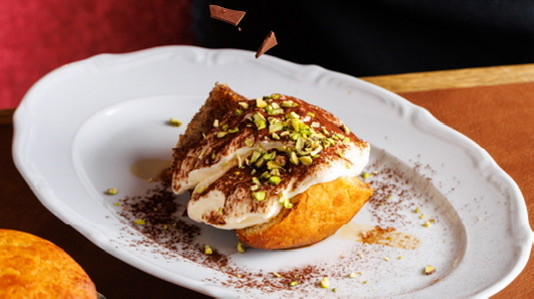 И, конечно, кулич: с кофейным ликёром, заварным кремом, шоколадом и фисташками — подаём прямо к столу.