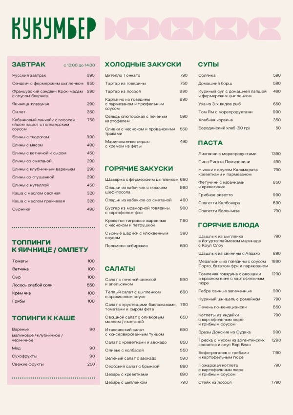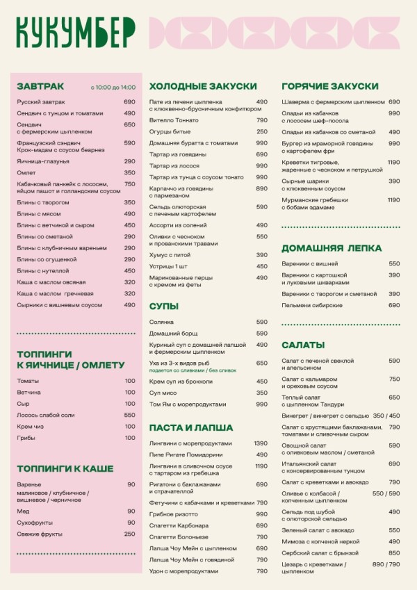 Ключевое слово многофункциональность: «Кукумбер» уместен для вечерних встреч под просмотр футбола, для красивых девичьих посиделок и для быстрого обеда во время удачного шопинга. Меню и целого мира мало: сибирские пельмени и поке, стеклянная лапша с цыпленком и румяные бургеры, премиальный камчатский краб и стейк рибай.