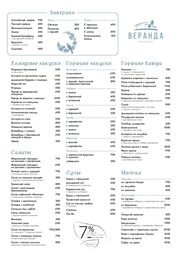 В ответе за меню — знаменитый шеф Ginza Вадим Скляров, специалист по европейской кухне. Пицца, паста, лёгкие и более сытные салаты, международная суповая классика (борщ, солянка, уха и другие), разные виды вареников и сибирские пельмени, сочный гриль — голодным уйти невозможно. А для закрепления результата подойдут нежные десерты. Для ранних пташек сервируются на завтрак круассаны, омлеты, каши, сырники и блины. Также не обделены вниманием и любители Азии.